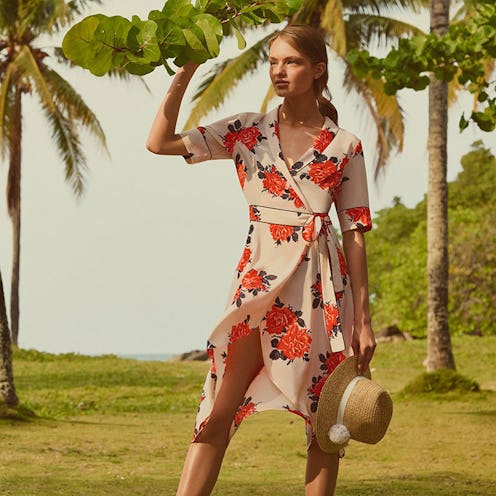 A silk crepe de chine dress in a vivid floral motif polishes up laid-back accessories like flat sandals and a straw bag. This wear-anywhere silhouette works for shopping, weddings and parties.