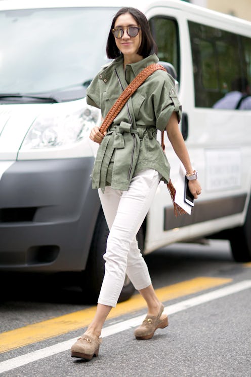 Take a cue from Eva Chen and pair your military staples with crisp white separates.
