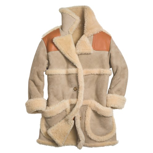 This oversized beige shearling boasts luxe leather panels and an exaggerated collar that will keep you cozy throughout winter’s coldest months.