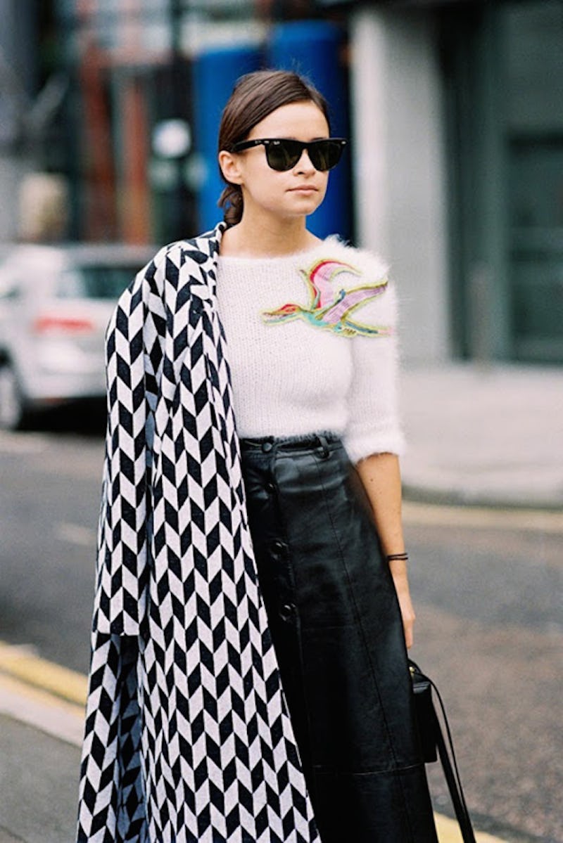 Cut the sexiness of the skirt by pairing it with a high-necked cashmere knit and a ladylike, tailored overcoat. Finish with a sleek metal choker and fuss-free accessories.