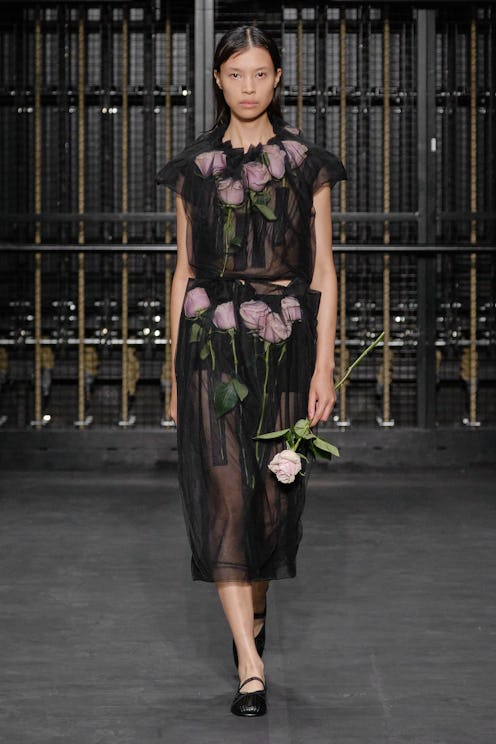 Rural, natural elements have been regular inspirations for the Central Saint Martins alum for some time. Last February, Rocha famously incorporated straw into her Fall/Winter 2023 collection, stuffing the material into ball gowns for unexpected texture and shape. This time around, sweet florals are the focus, strategically layered into the elaborate designs in a similar fashion. Just like the veiled bunches of hay seen last season, long-stemmed, whole roses were tucked under sheer, tulle dresses and bunched at the chest and hips, accentuating the natural curves of the body. On nylon anoraks — set against a color palette of soft pink, olive green, khaki, sky blue, and black — large rosette appliqué’s were placed at the shoulders and chest. In a supersized moment, Rocha sent a model down the catwalk in a cropped sleeveless top made entirely of soft fabric roses, paired with satin black trousers featuring a coordinating bloom at the hip. (The botanical was even painted directly on the cheeks of a select few models, further demonstrating the designer’s devotion.)