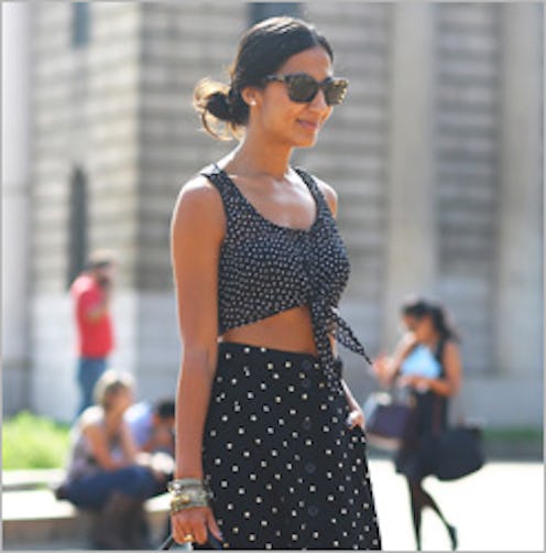 August is arguably the most difficult month to get dressed. The solution? Stay inspired by incorporating transitional pieces into your wardrobe, like a full skirt. Here, a fashion-forward individual in Milan shows us how it’s done by teaming the modest, flared piece with a sleek crop top and of-the-moment accessories.