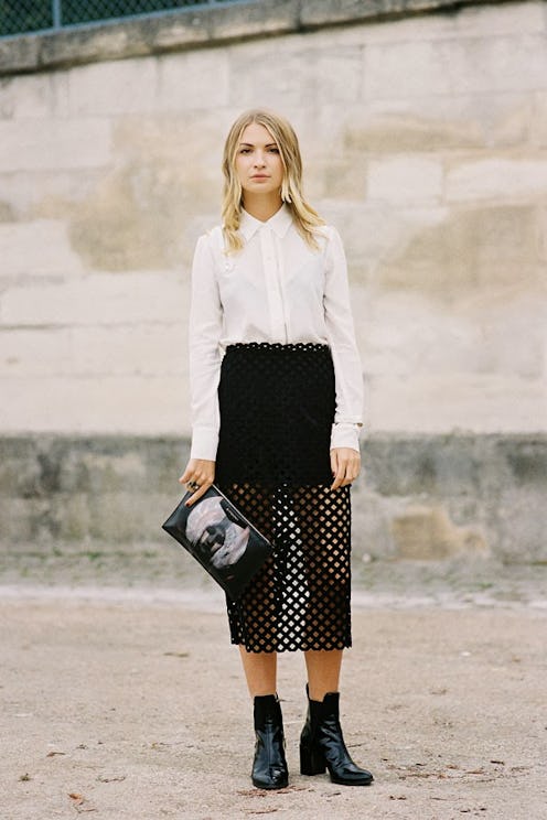 Transparency is a trend that’s always in style but how to rock the look in 2014? We love somewhat see-through skirts paired with menswear pieces and edgy extras. Case in point: this black and white ensemble snapped by Vanessa Jackman at Paris fashion week. It’s a cool play on boy-meets-girl and a deceptively comfy outfit for a day on the town. Shop each piece for under $350, below!