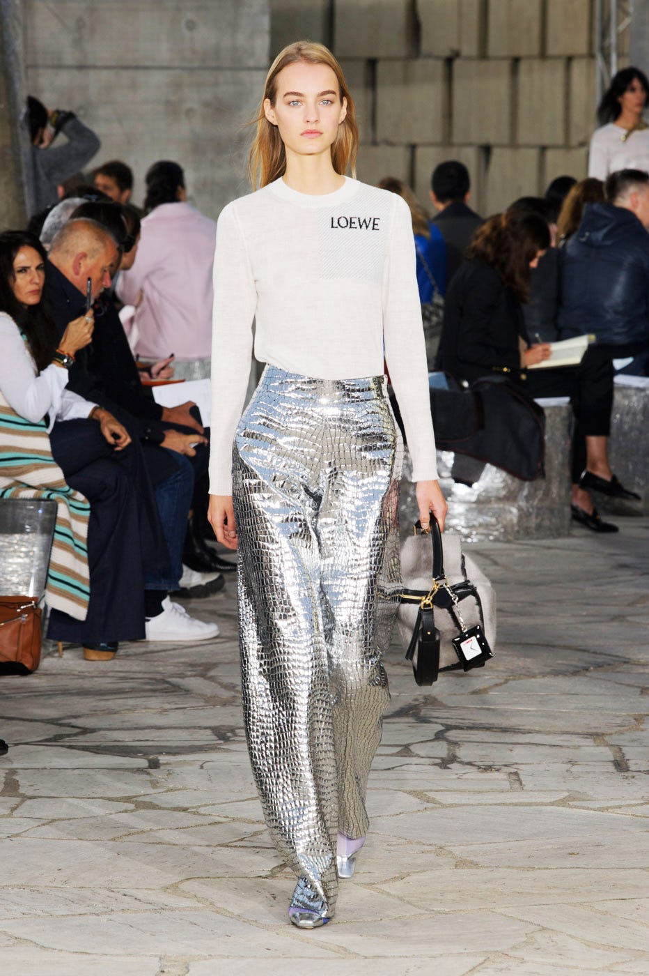 If you aren’t into sequins and shimmer, breathe easy. At their Paris fashion shows this week, Isabel Marant and Loewe offered a futuristic alternative to metallics, sure to suit even the most laid back of ladies. These modern foil pieces, whether on wide-leg trousers or ruffled miniskirts, were brought into daytime territory thanks to sculptural silhouettes and savvy styling. So before you dismiss the high-shine trend as the stuff of club kids and bachelorette parties, take a page from these cooler-than-cool designers and team a sharp foil staple with a snow-white knit and flats. Shop the style, here.