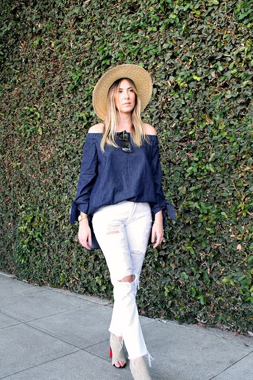 In LA, Lauren takes a fresh approach at double denim (after all, it's what Angelenos do best). Distressed vintage jeans, block-heel sandals and a straw boater hat keep the vibe low-key and relaxed.