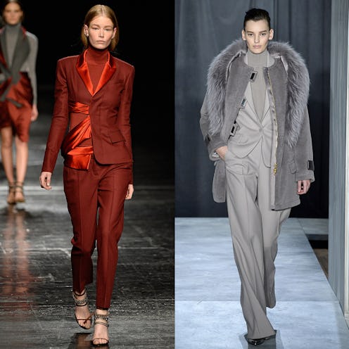 Rule 2. Look for tuxedo touches. We loved the satin accents on Prabal Gurung’s cranberry-hued suit and the way Jason Wu incorporated shine through a glamorous grey coat. Look for similar silky details or add-ons to ensure your suit doesn’t read as interview attire.