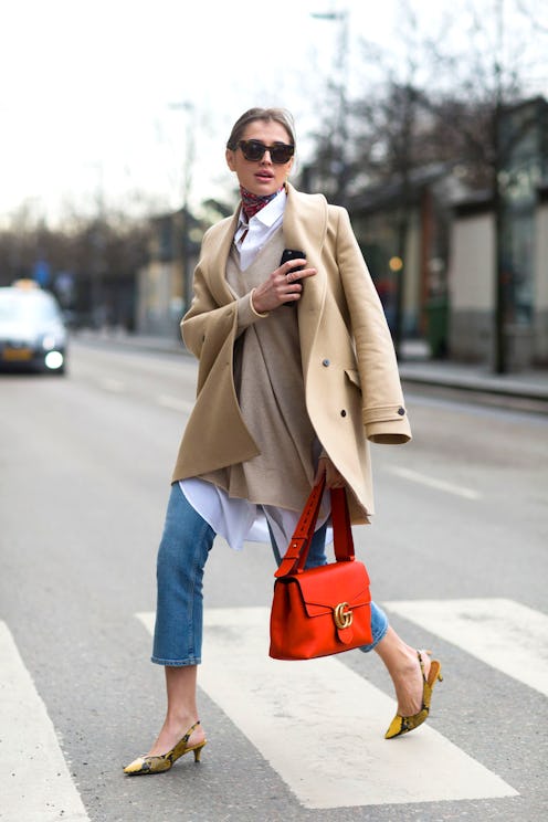 Elevate a cropped jean with a longline button-down tunic and classic camel coat. Add interest with a multicolored snakeskin-print pump and tie it all together with a poppy leather satchel.