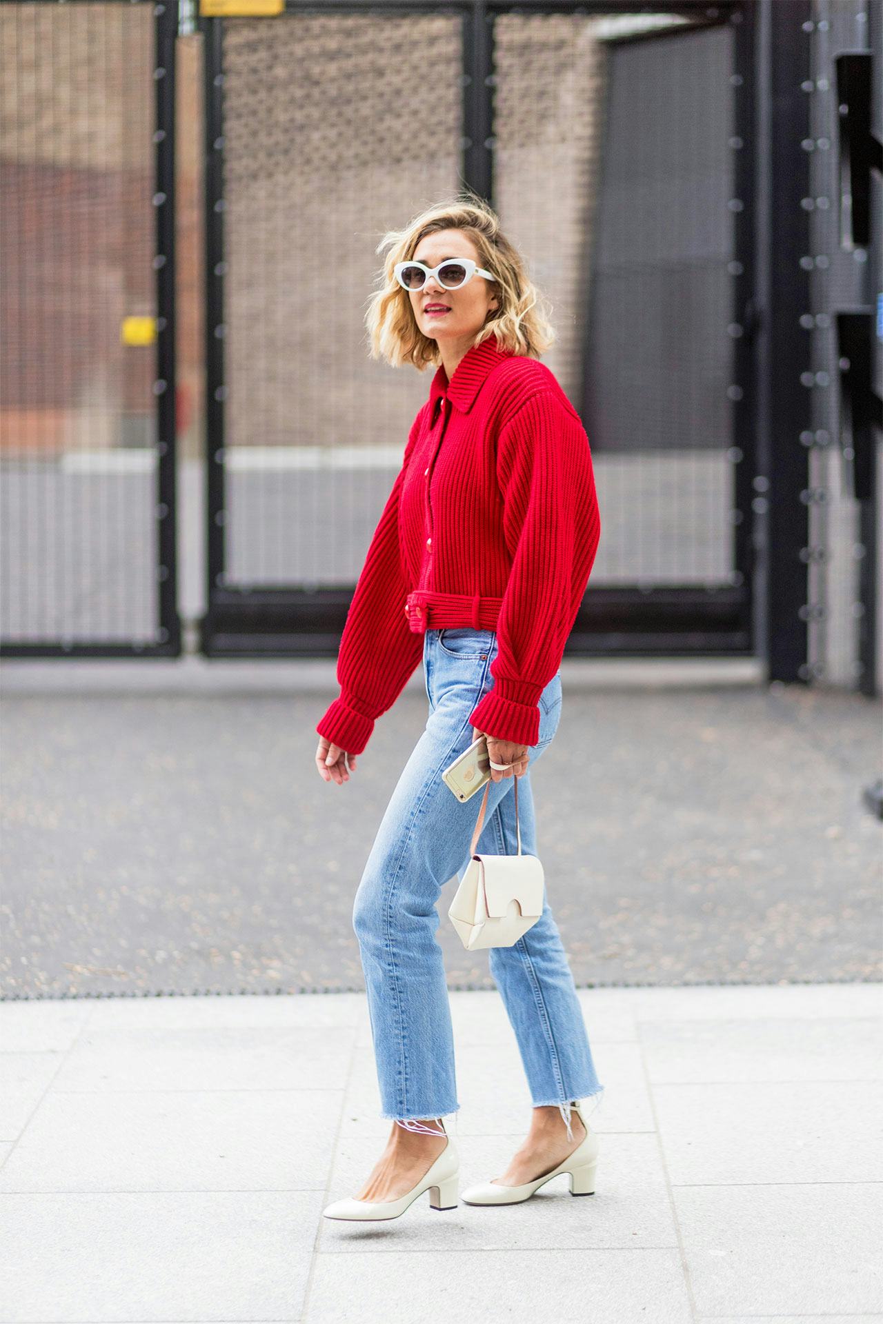 Effortless yet polished, this ruffled blouse and lace-up denim pairing is the perfect marriage of off-duty and fashion-forward. Throw on bright slingback pumps for color and a neutral structured cross-body bag to temper the trends.