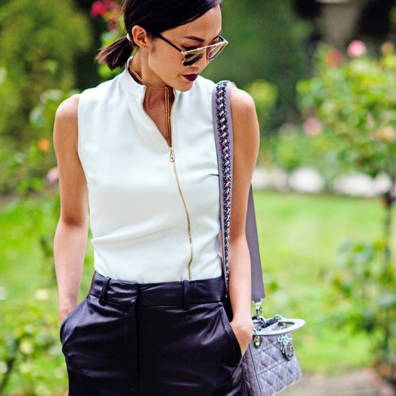 Choose a printed dress rendered in a darker, autumnal hue to pair with the staple moto jacket. When it's too warm the mini frock will keep you breezy, while the leather topper can be casually draped over the shoulders when there's a slight breeze. Once it actually cools down add a pair of tights and suede ankle boots.