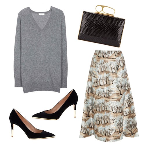 Marni Printed Skirt, $1250; Equipment V-Neck Sweater, $288; J.Crew Everly Pumps, $265; VC Vince Camuto Ring Clutch, $175.