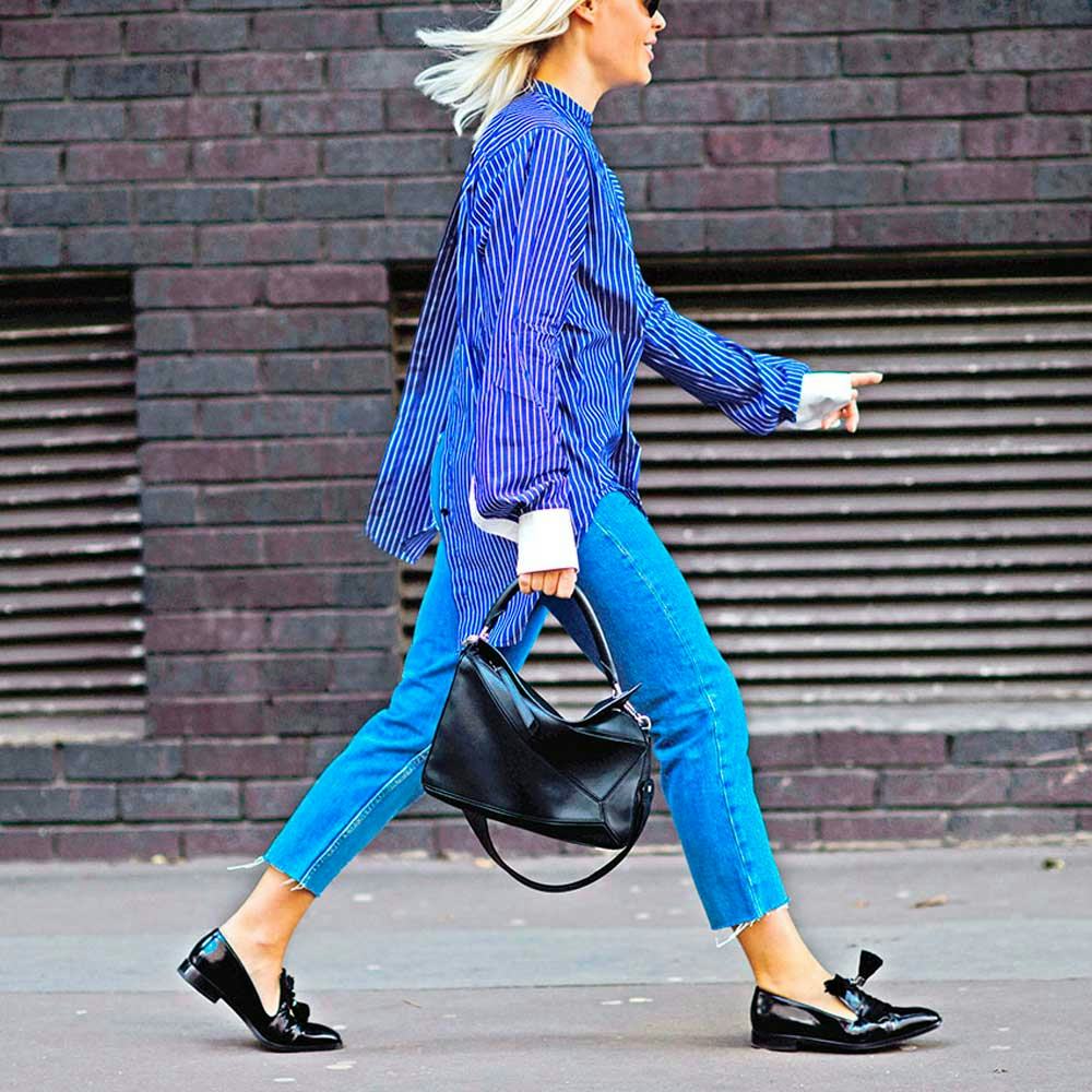 A thin tunic layered over jeans feels entirely fresh when worn partially unbuttoned and teamed with sneakers and neutral accessories—a top-handle mini bag is an of-the-moment choice.