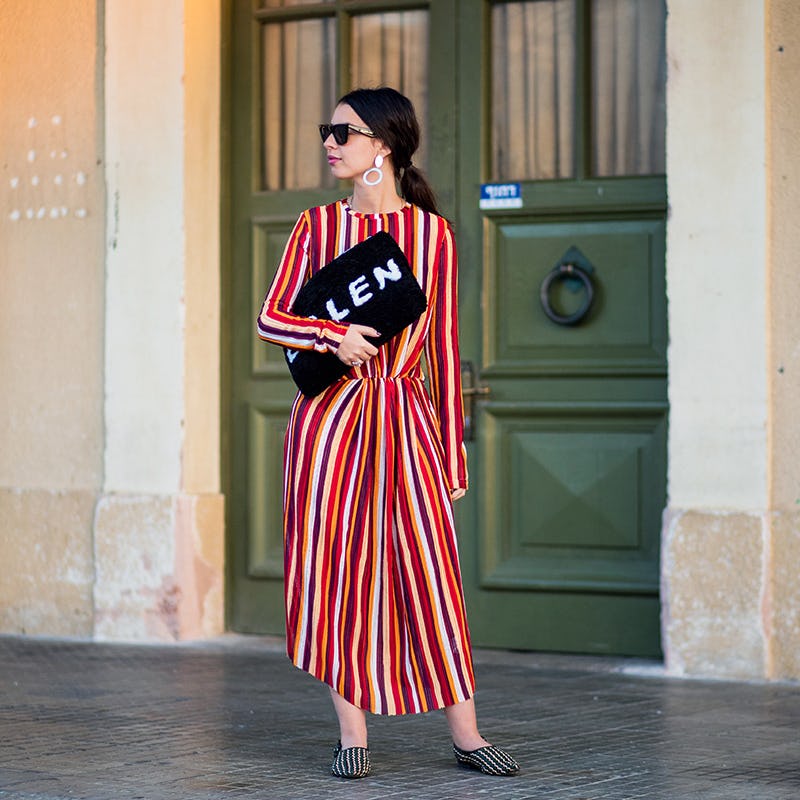 A dress and jeans combo is a fashion-forward yet wearable way to switch it up. Choose a long lavender number to cinch with a clear PVC belt. Throw on a dark pair of jeans and pastel pink slingbacks. You'll look like a street-style star, guaranteed.