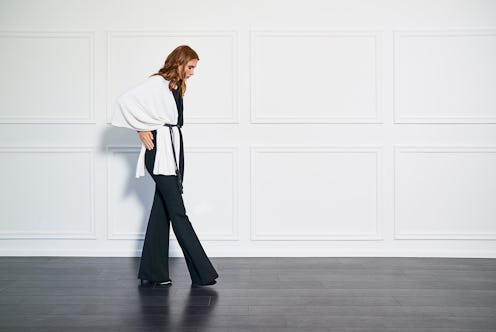 Accessorize an office-ready look with a statement top-handle bag and the belt cinched at the waist.