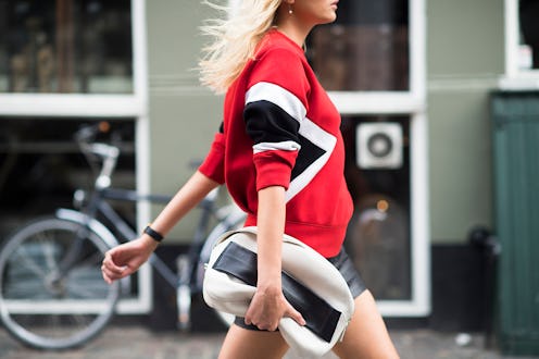 "Your printed shorts can be fall-appropriate, as long as you add plenty of layers. Think a button down, warm sweatshirt and a slouchy trench coat. Finish with tights and brogues for the perfect weekend ensemble."