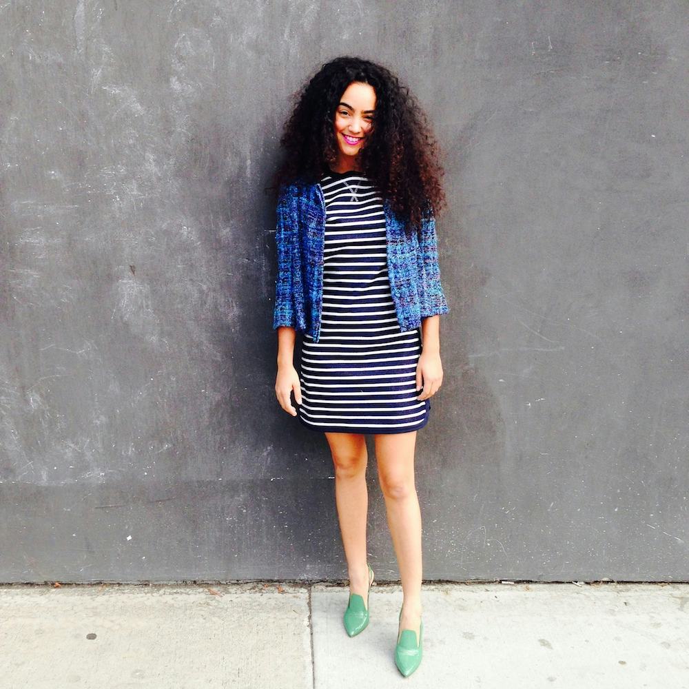 Rachel Zoe Studio intern Nadia Beeman styled her Warren Striped Dress with a cropped tweed jacket, bright pumps and even brighter lipstick for an overall colorful, chic look. Try this outfit for a day date to a museum.