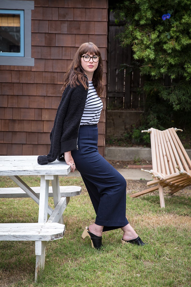 Style the jacket with tailored culottes, a classic striped tee and some wooden clogs to get a more structured look. Swap out the clogs for a pair of sleek pumps and you're ready for a day at the office.