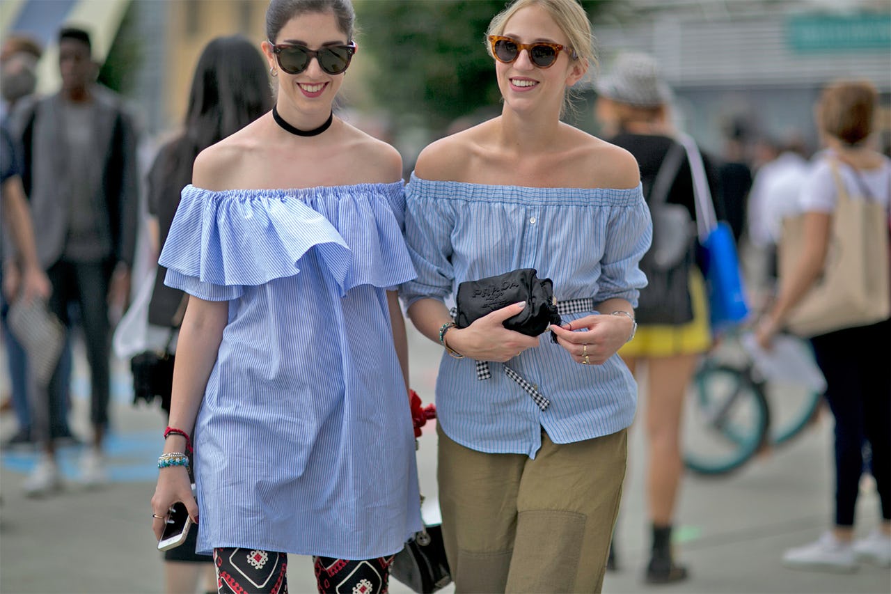 If you are apple-shaped or tend to carry weight at your waistline, opt for the ubiquitous off-the-shoulder top. Its roomy silhouette skims the tummy and focuses the attention on your upper body.