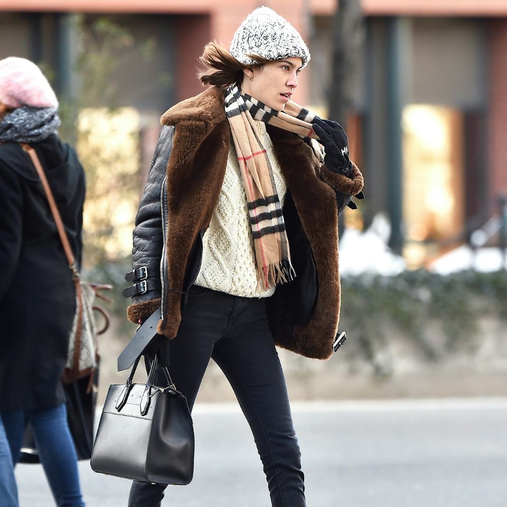 A chunky cable knit is a wardrobe mainstay. Style yours like Alexa Chung with a shearling jacket, plaid scarf and knit beanie for added warmth.