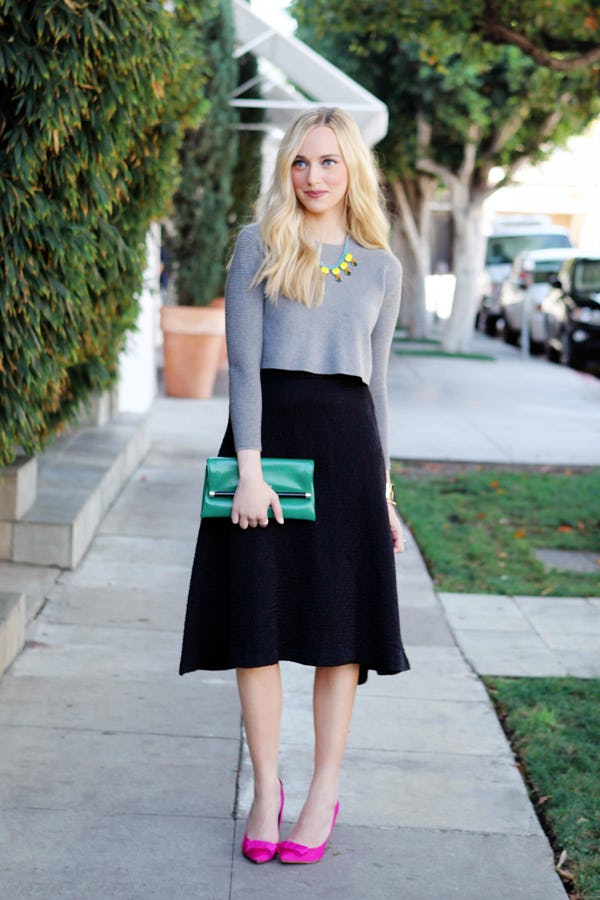 Whether you buy vintage or new, a midi skirt with full volume is key to channeling the fabulous '50s era. We suggest choosing something in a solid, neutral tone to give you more playing room when it comes to your accessories.