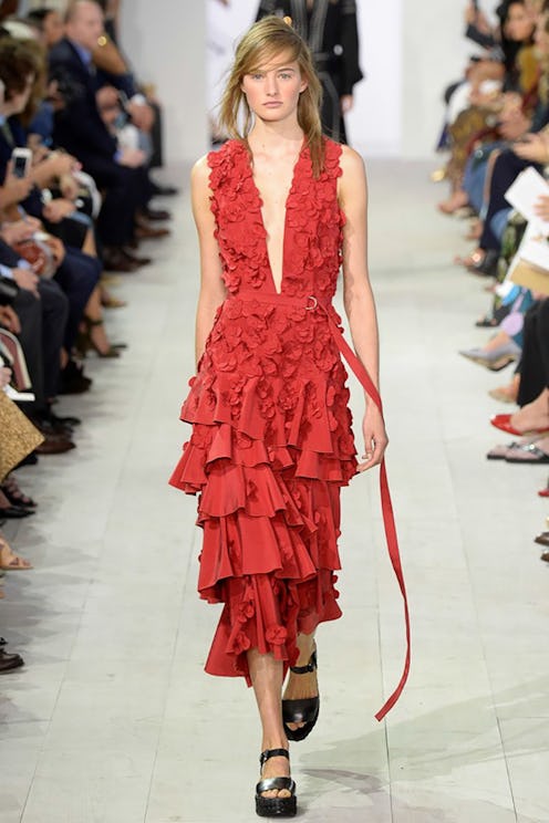 Michael Kors is known for deftly combining femininity with sportswear, which is why he manages to create a beautiful-yet-wearable collection season after season. For spring 2016 he showed everything from grommet-studded skirts and sporty tanks to diaphanous printed dresses and luxe tailoring. While we loved the wide-leg trousers and lace skirts, our favorite look was (by far) this tiered red beauty featuring a deep v-neckline and midi-length skirt. Thanks to the flower appliqués and chunky sandals, the traditionally bold hue looks demure and approachable, so we naturally can’t wait to recreate the look ourselves. See some of our other favorites here.
