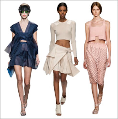 Milan Fashion Week has come to a close and while the city isn’t known for its sporty, casual style, the crop top appeared on numerous runways, just like the New York shows. In Milan, the must-have piece was given a sophisticated spin paired with same-color skirts or shorts and rendered in uber-luxe materials like leather, snakeskin, and beaded fabrics.