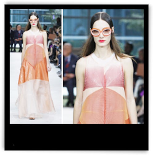 Missoni’s spring show in Milan boasted colorful ensembles and a slew of sensational dresses featuring veils of organza and sequins. Our maxi dress du jour is a magical mix of pink, white, orange and peach constructed into a feminine silhouette with a slight geometric edge. If you love the look for spring but want a more pocket-friendly alternative, try Topshop’s tasteful tangerine version; then all you need are bright sunnies, nude sandals and bold lipstick to conjure up Missoni’s runway look on your own!
