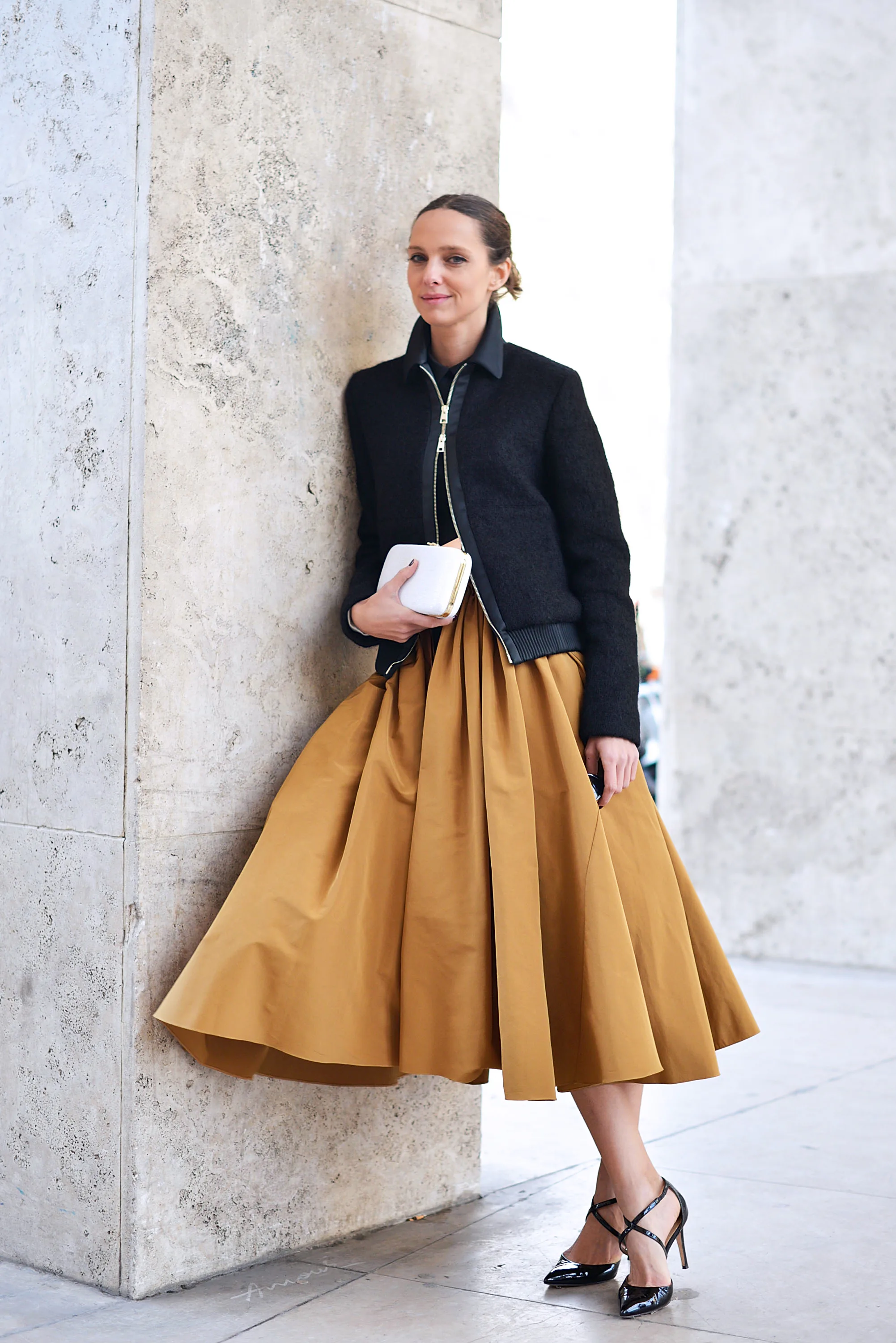 Right now the streets of Paris are flooded with amazing style for Fashion Week making it the best time of year to observe the latest and greatest trends in motion. Since a voluminous skirt is one of the most glamorous yet tricky silhouettes, we have broken down how to style the look in a modern way. Getting this trend right is worth celebrating, so find your perfect party skirt and hit the town—champagne flute optional.