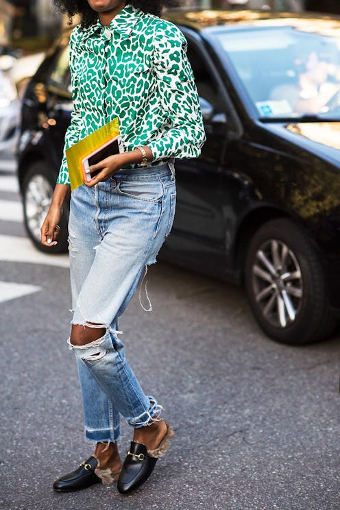 Dress up distressed jeans with a pair of retro heels in a punchy color—the unrolled edges lengthen legs, so tall stilettos or stacked heels will further amplify. Finish with a feminine blush-hued tank and polished white shoulder bag.