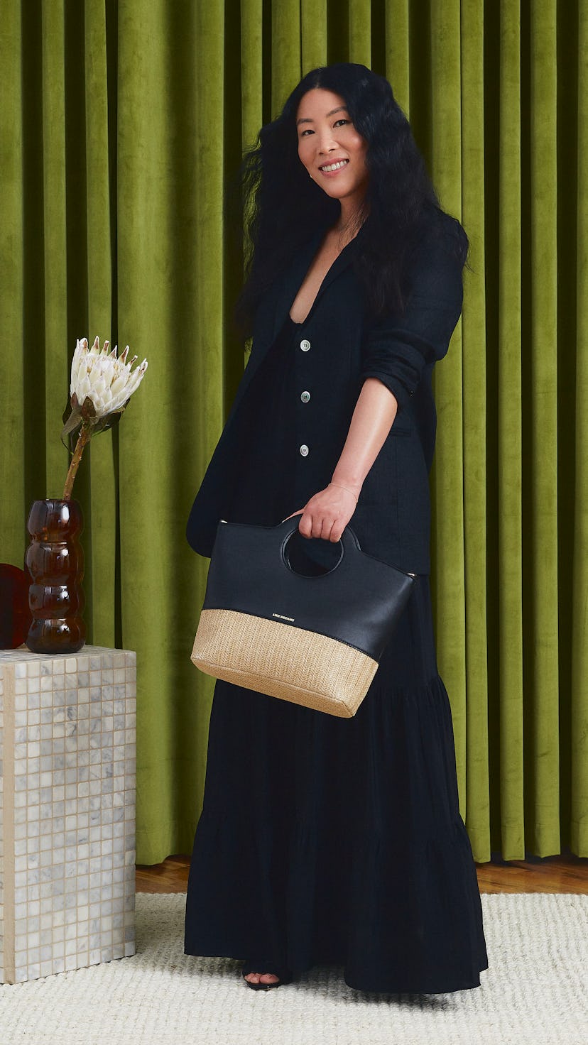 In the summer, linen is a breathable yet protective powerhouse. “I appreciate linen even more now, as sun protection has become a major priority for me,” Lee says. “Instead of always wearing skin-baring clothes when the heat is unbearable, I now opt for linen to cover my skin, as it also allows for ventilation.” Enter: This oversized Nicole Miller linen blazer. Another capsule essential? The new LBD (long black dress). Block heels finish the look, which feels ideal for shopping with friends, or sipping spritzes al fresco on your favorite rooftop.
