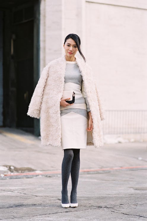 There’s no shame in viewing the New Year as the sartorial equivalent of a clean slate. In fact, we wholeheartedly encourage taking the first Monday of the year as an opportunity to shake up your workwear wardrobe. Rather than reach for the humdrum skirt-and-shirt combo, try amping things up a notch by way of a subtly curve-hugging, color-blocked shift dress, matching tights and white (that’s right, white!) pumps. The look is fresh, office-appropriate and totally unexpected. Top it all off with a fun faux-fur coat and get ready to climb that corporate ladder in style.