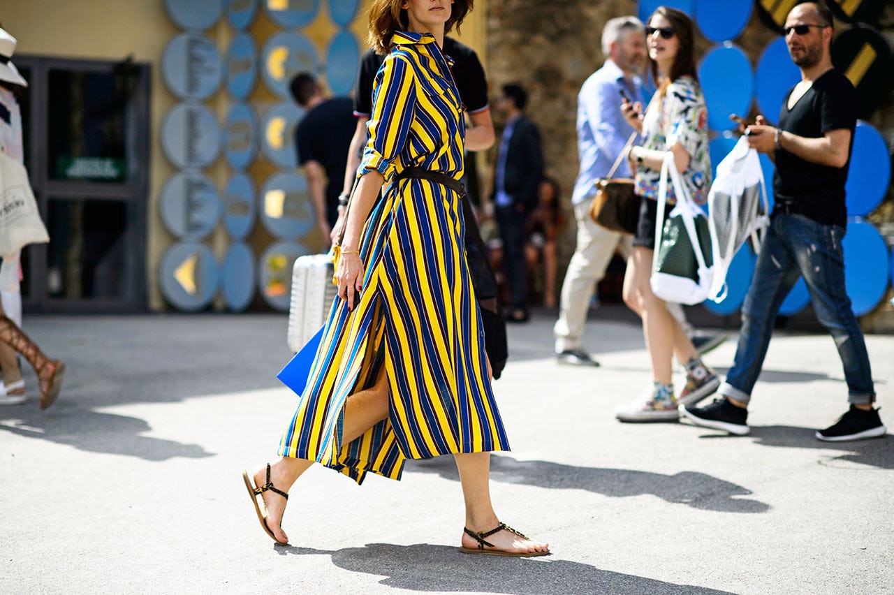 Taking its inspiration from traditional boys' school uniforms, a bold vertical-stripe shirtdress looks sharp enough for roll call.