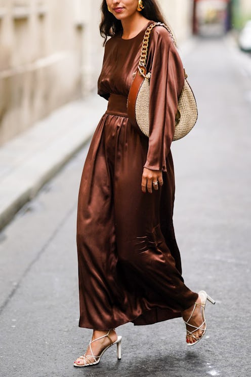 Having grown up in the English countryside, stylist Rebecca Dennett’s work feels imbued with a sense of mysticism and romance. She contributes to publications like Elle US, Allure, and The Sunday Times Style Magazine and has helped style and produce shoots for Christian Dior, Salvatore Ferragamo, and Oscar de la Renta. For a fall wedding, she’s leaning into a high-impact dress that’s also weather appropriate. “I love this Carolina Constas dress, it’s a perfect color for a fall wedding and also long-sleeved, so you don’t need a jacket,” she says. “It has a special feeling without overpowering the bride’s big day ... a go-to fall wedding look for me.” Dennett notes a square-toe heel would be the perfect accompaniment. And to let the dress do the talking, keep jewelry minimal — opt for sleek, silver, sculptural earrings.