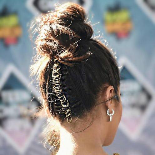 Like her Pretty Little Liars costar Lucy Hale, Shay has played around with wire as a hair accessory. To re-create this look, make two adjacent buns and then twist silver wire into opposite ends of each one.