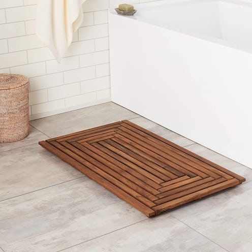 If you’re unsure about which option to go with, here’s what you need to know. Teak is a heavier wood that’s coveted for its naturally water-resistant oils, making it a long-lasting option that also has a rich color. While technically a grass, bamboo is a popular wood-like material that’s typically lighter than teak in color and in weight, and it often will come with a water-resistant finish to keep it looking great. Regardless of the type of wood you choose, your bath mat will need drainage — vertical, horizontal, or patterned slats will allow water to pass through and give the mat some extra visual interest. And if you’re looking for an option you can store out of sight when it’s not in use, consider a bath mat that can roll or fold up.