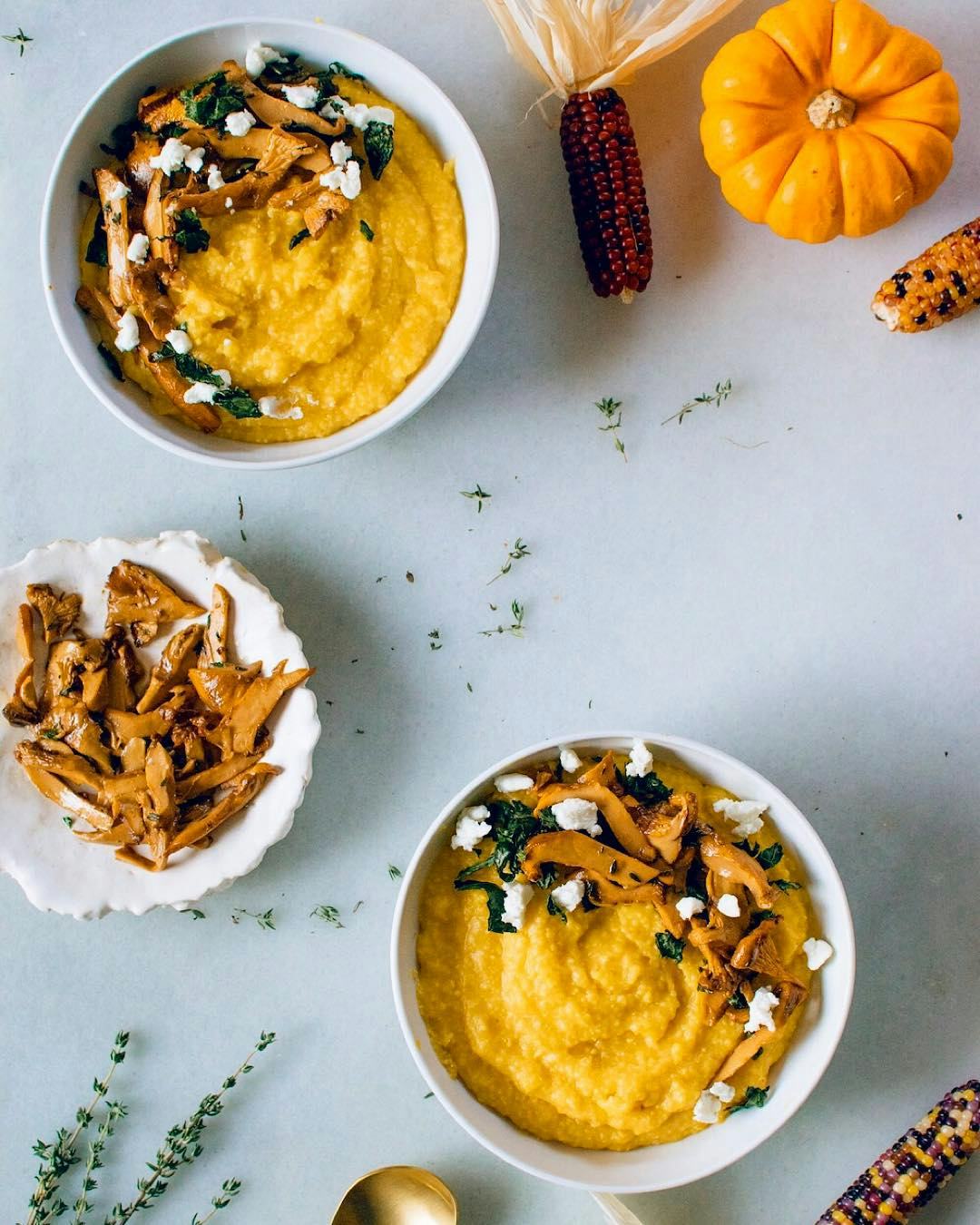 Pumpkin Goat Cheese Polenta with Brown Butter Thyme Mushrooms & Kale