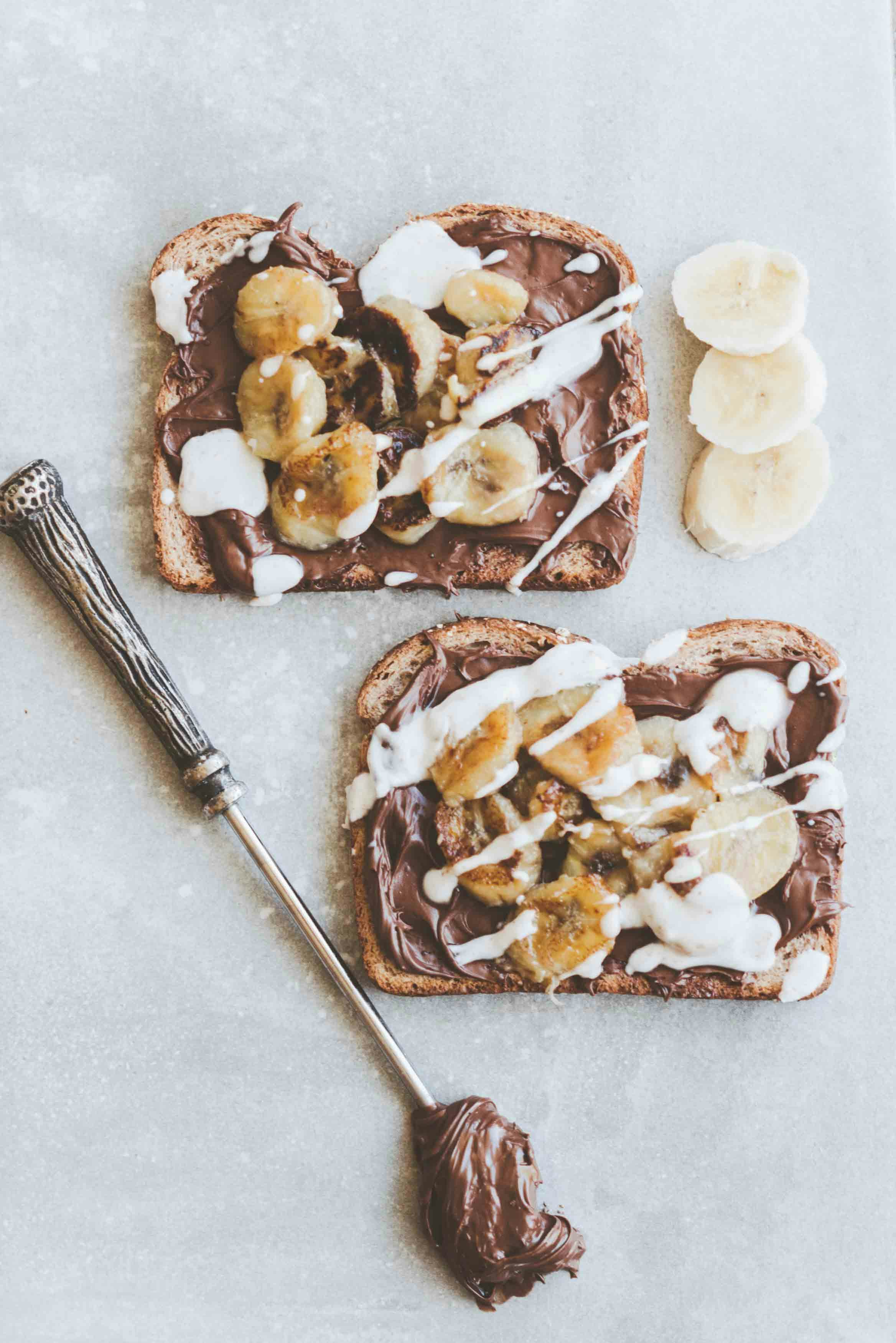 Ingredients: 1 banana, sliced 1 Tbsp butter 1 Tbsp Greek yogurt ½ Tbsp honey 1 tsp milk (optional) 2 slices good sandwich bread 2 Tbsp Nutella