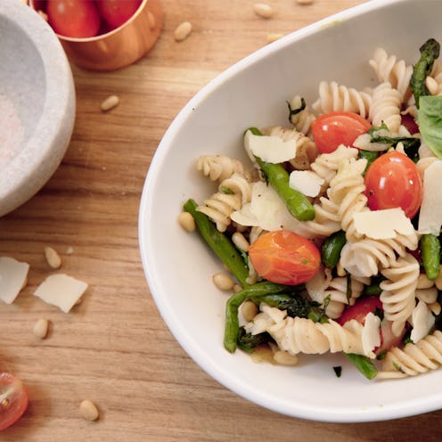 Garden Veggie Pasta Ingredients: 2 cups TJ’s Gluten-Free Organic Brown Rice & Quinoa Fusilli Pasta 1 1/2 Tbsp TJ’s Clarified Butter (ghee), plus more if desired 1 1/2 cups trimmed and cut asparagus (sliced into thirds) 1 1/2 cups mini pearl grape tomatoes 1/2 cup fresh basil (sliced into thin strips) 1/2 lemon 1/2 cup TJ’s Dry Toasted Pignolias (pine nuts) 2 Tbsp TJ’s Shaved Cheese Blend