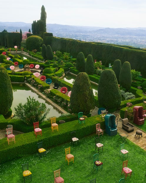 There’s no better way to take in this collection than Gucci’s new campaign, which was envisioned by Gucci’s creative director Alessandro Michele and brought to fruition by photographer and art director Max Siedentopf. Together, the two created an eccentric, eclectic scene set in a pristine topiary garden with color, playfulness, and drama of Bridgerton-level proportions. Hedges are carved in shapes echoed by the new pieces, and the lush hues of the greenery enhance the vibrancy of each design. It may not cite direct inspiration from the Regency era, but it would almost definitely be Queen Charlotte-approved.
