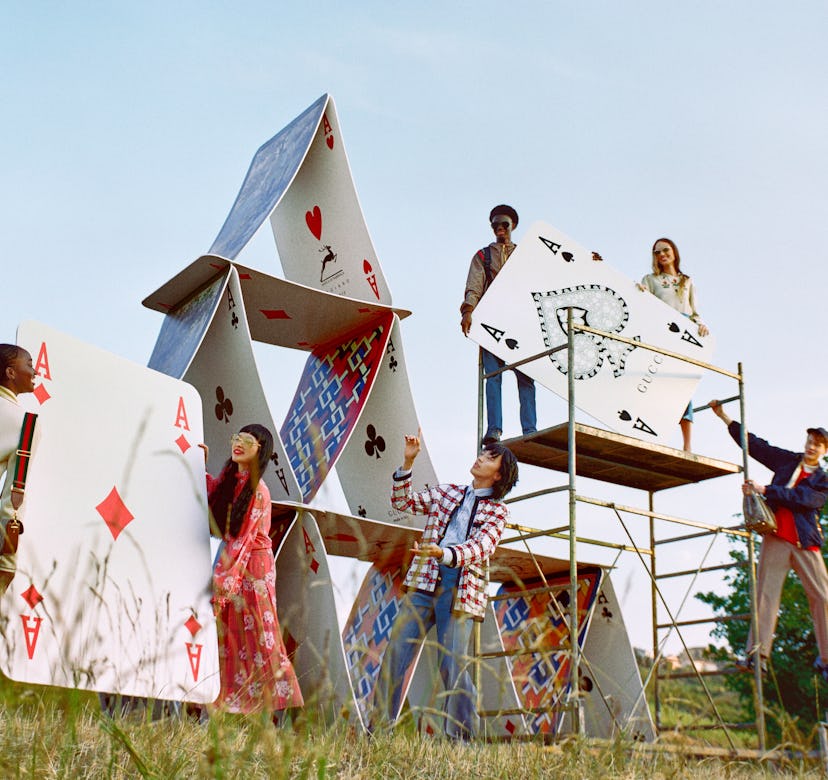 As expected, the Lifestyle collection is accompanied by a fantastical campaign, which was photographed by Max Siedentopf in Tuscany at Castello Sonnino (a 16th-century fortress built by the Medici family). Much like Gucci Cartoleria, the images depict a dream-like scene with Alice in Wonderland-esque surrealism: cards are larger than life, dogs play poker, etc.