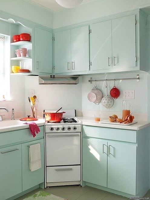 Trick: Get creative with new storage solutions. A hanging rack for pots and pans keeps kitchen counters clutter-free.