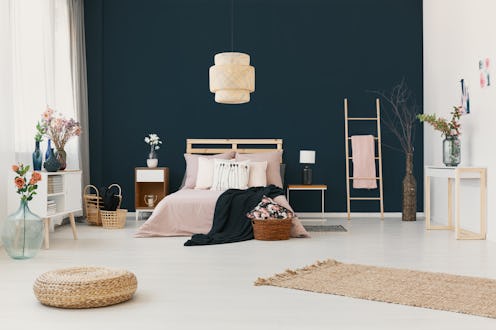 But Sybille Zimmermann, founder and interior architect at Studio Zimmermann thinks doing deep isn't a bad idea either. "Another shade I love for the bedroom is Benjamin Moore's Hale Navy, which is almost black with a hint of blue," she says. "I used this paint color in a bachelor's master bedroom to create a masculine yet elegant feel at the same time. We offset the dark walls with white bleached oak millwork and bed frame, reclaimed wood floors, jute rug, and a vintage Eames chair upholstered in a funky patterned fabric."