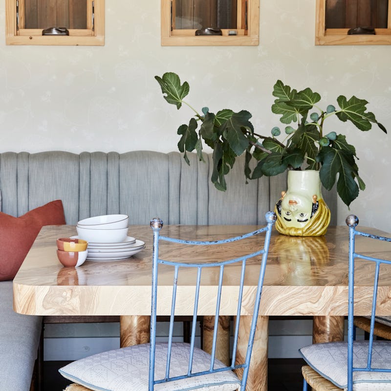 Vintage pieces are also great for creating dimension, adding warmth, and breaking up design tones to avoid an overly curated or matchy-matchy look. “I’m a big fan of incorporating vintage pieces into a kitchen space,” says LA-based interior designer Stefani Stein, who’s all about the mix. “Vintage lighting is always a great idea as well — just be sure to have it rewired, so it isn’t a fire hazard.” Wallpaper, handmade tile, colored cabinetry, rich wooden paneling, pendants, sconces, and cafe curtains are other elements Stein says play well with vintage pieces, all of which create depth and uniqueness in a space.