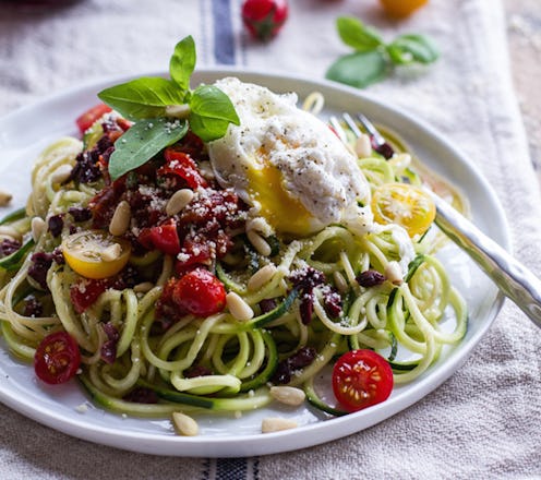 Zucchini Pasta with Poached Eggs and Quick Heirloom Cherry Tomato Basil Sauce