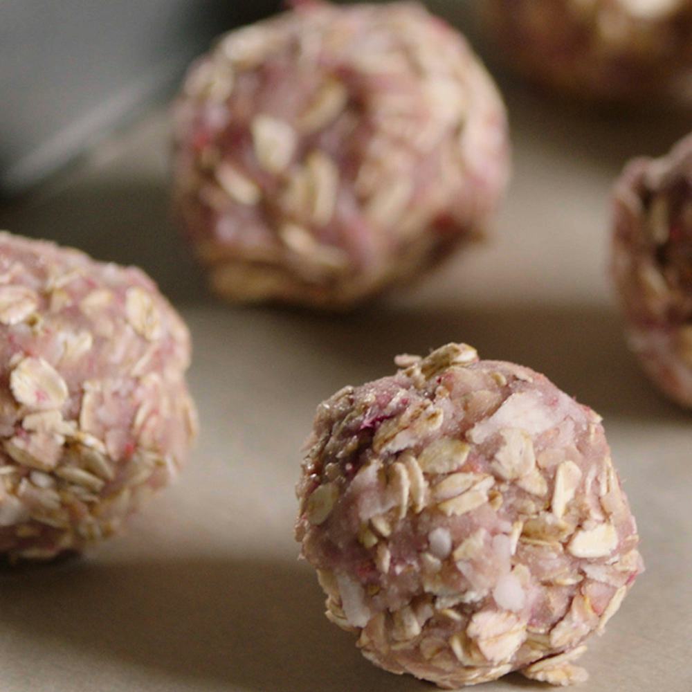 Directions: Combine all ingredients in a mixing bowl. Roll mixture into balls by the spoonful. For the coating, crush freeze-dried raspberries into a powder and mix with shredded coconut. Roll balls into coating. Place balls on a parchment-lined baking sheet and refrigerate 15 minutes.