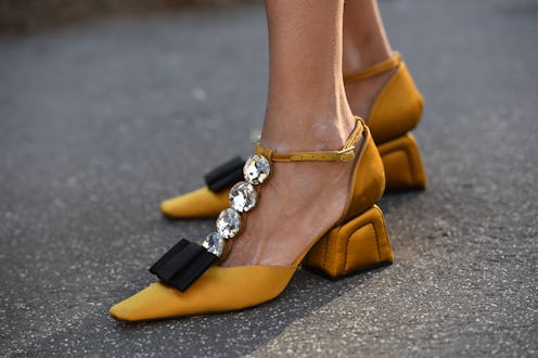 This season, four key trends emerged when it comes to the illustrious party shoe: Designers like Attico and Amina Muaddi sought to usher in the valiant return of the ‘80s-inspired slingback pumps you may have caught on your feed recently — fully decked out in sumptuous satin or suede and embellished with over-the-top jewels. Others brands, including Brother Vellies and Tabitha Simmons, revived the use of plumage, as sky-high heels were trimmed with lavish feathers in lavender, pale pink, and vibrant red. Decadence and drama also appeared in the form of embellished stacked heels dusted with swinging crystal fringe and colored jewels. So, whether you slip on velvet kitten-heels or opt for high-shine mules, the latest offering of extravagant party shoes are sure to make you weak in the knees (but not weak enough to stop you from busting a move). Below, find the four key shoe trends for party season, and all the inspiration you need to help steer you in the right direction when in search of the perfect pump.