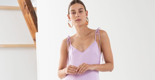 For those who tend to gravitate toward clean, simple designs, this Shoulder Tie Midi Slip Dress from & Other Stories for $69 may just be what you're looking for. A minimalist's dream dress, this lavender satin midi is calling for a set of sculptural earrings and a barely-there sandal that you can dance the night away in. For a longer silhouette, peek at this minty-green tie-collar dress from H&M. Ringing in for $79.99, the style's elegant floaty shape will look just as chic paired with a simple slide for a breezy beach wedding as it will matched up with a metallic heel for a black-tie affair.