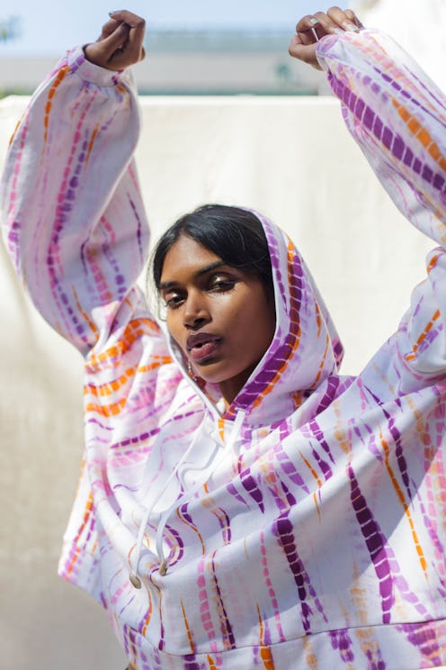 This emerging womenswear brand draws on South Asian silhouettes, incorporating a Japanese tie-dye technique called Shibori for their striped sweatshirts.