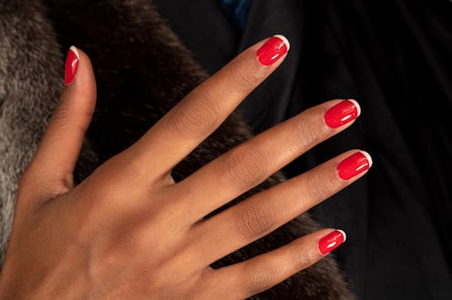 To achieve this classic red look, "first apply two coats of JINsoon Ardor to all nails," JINsoon salon tells TZR. "Then, using a striping brush, paint a C-shape at the tip of the nail in JINsoon Prim. Finish by applying JINsoon Top Gloss, which is a top coat."