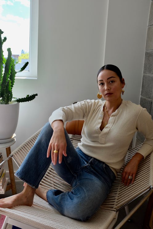 "These days, I've been leaning heavily on a vintage pair of white Levi's 555 for its guys straight, loose-fit that feigns the comfortability of sweats, but is still semi-tailored," Brie Welch, editorial stylist whose worked on shoots for Into The Gloss and Vogue Italia, tells TZR. She's pairing her laidback Levi's with a few different tops. "Worn with a rotating potpourri of vintage tees, like this boxy Mickey Mouse one, or a classic striped button down." For jewelry, she's wearing gold Loren Stewart and Ariel Gordon chains. "Plus, my favorite pair of red Charvet slippers elevate my simple uniform, even if no-one sees them," she adds.