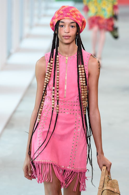Hair accessories are never exclusive to longer lengths. The models at Dior wore headbands and headwraps, reminiscent of dancers. “Every model has different headbands on, very thick, all inspired by movement," Palau tells The Zoe Report backstage on Sept. 24. “We’re wrapping the hair around the head, creating a fold in the back in a design. It’s very beautiful within itself without any lumps or bumps or knots. It’s much more of a simple silhouette when you see it. Even though it’s subtle, the hair would look very different if we pulled it back into a chignon — this look feels more experimental but still feminine.”
